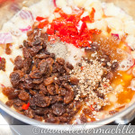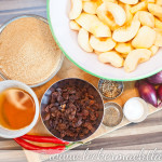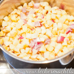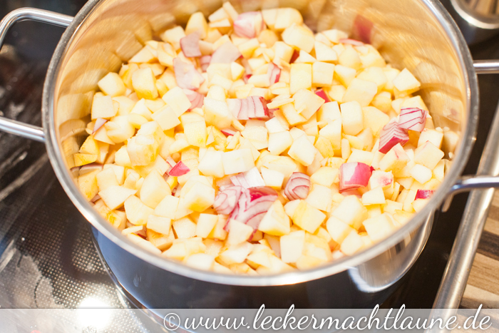 1. Zuerst die Zwiebeln und Äpfel würfeln und mit 100g Wasser zusammen aufkochen. Sobald das geschehen ist,10min köcheln lassen.