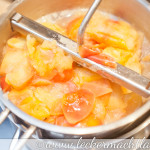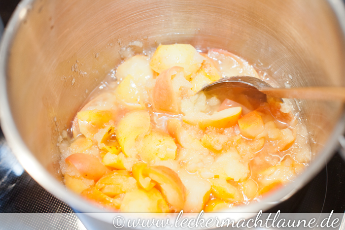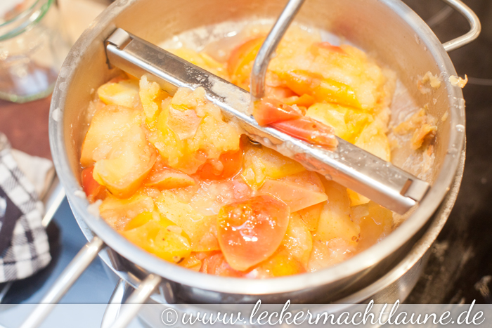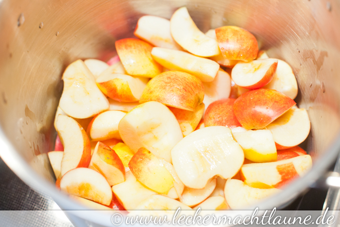 1. Äpfel mit etwas Wasser zum kochen bringen und so lange köcheln, bis sie weich sind. Anschliessend durch eine flotte Lotte passieren.
