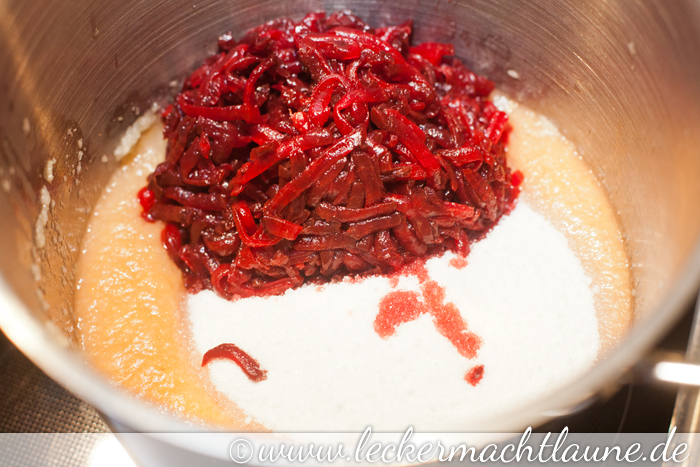 2. Rote Beete raspeln und zusammen mit dem Zucker zum entstandenen Apfelmus geben.