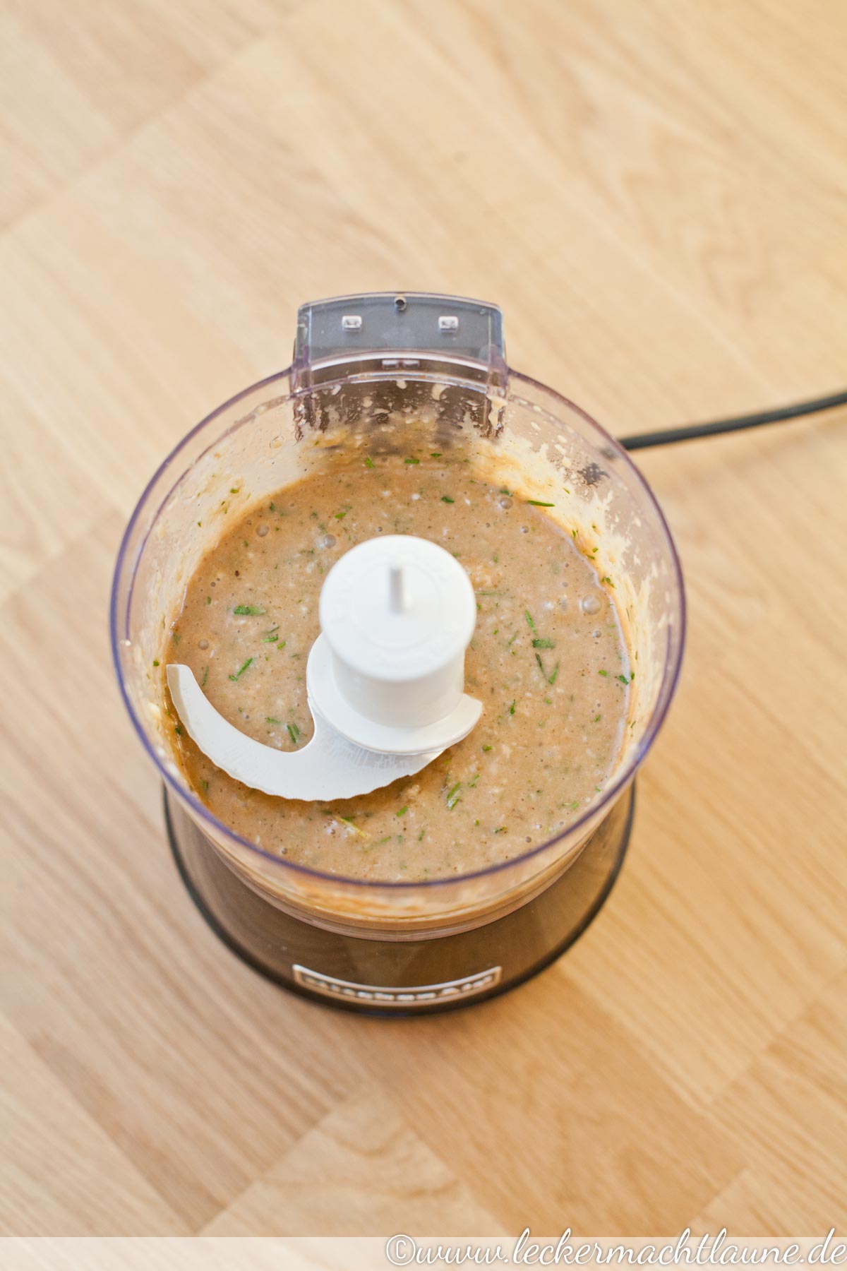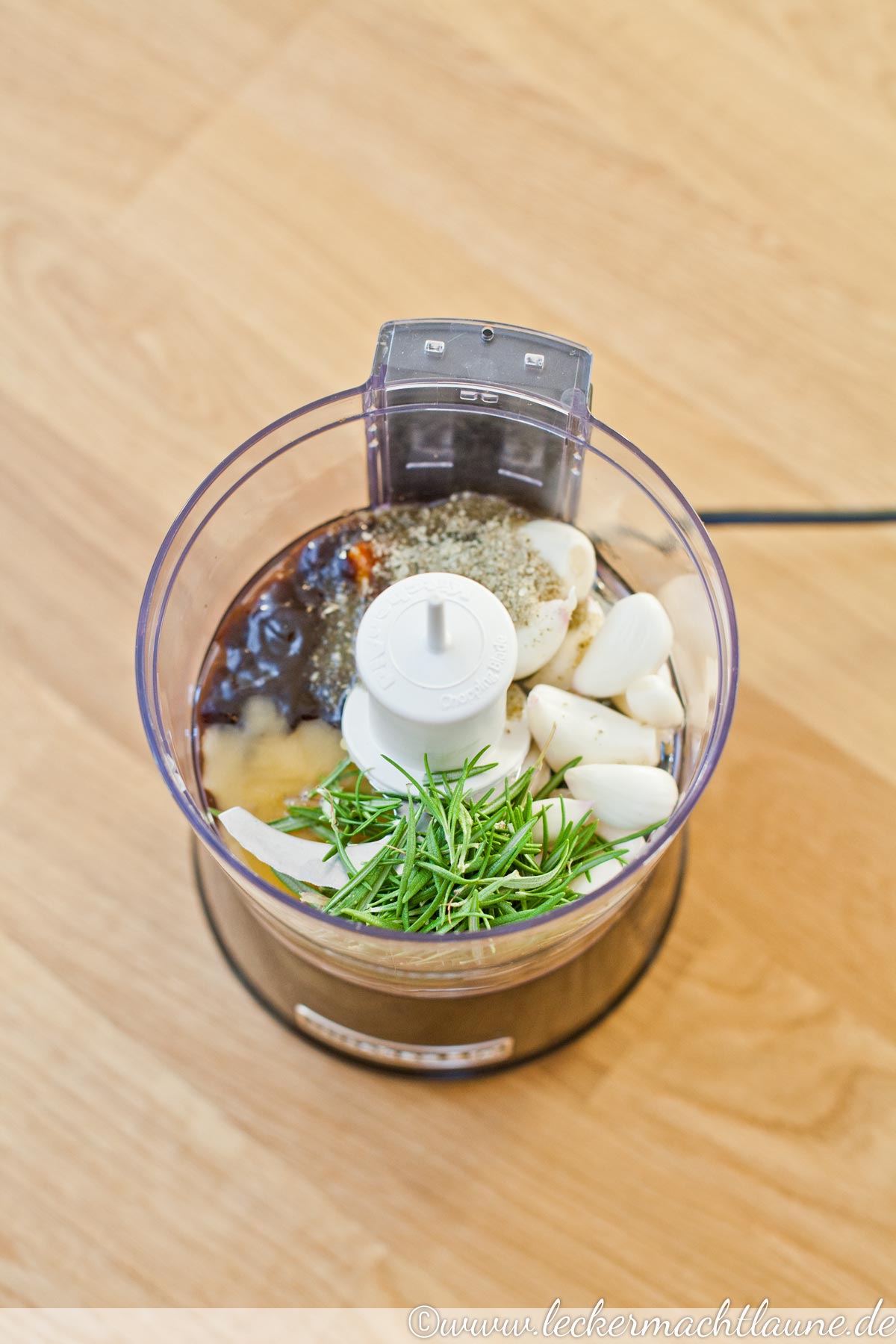 1. Knoblauch und Rosmarin klein hacken und mit den restlichen Zutaten für die Marinade vermischen. Ich gebe einfach alles in den Zerhacker* und erhalte eine schöne Masse für die Marinade.