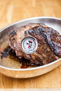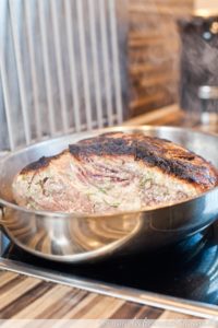 3. Eine Ofengeeignete Pfanne (oder einen Bräter) mit ein wenig Öl erhitzen und das Fleisch darin rundum von allen Seiten scharf anbraten. Danach kommt die Hohe Rippe in den auf 100°C Ober-/Unterhitze vorgeheizten Ofen so lange bis das Thermometer eine Kerntemperatur von 58°C anzeigt. Dann ist das Fleisch rosa und wahnsinnig zart. Bei mir hat es übrigens ungefähr zwei Stunden gedauert.