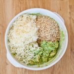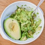2. Jetzt das Avocadoinnere mit einem Löffel aus der Schale holen und mit einer Gabel zerdrücken. Danach mit den restlichen Zutaten vermischen und anschließend mit Salz abschmecken. Fertig. 🙂