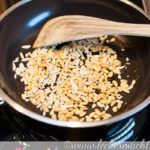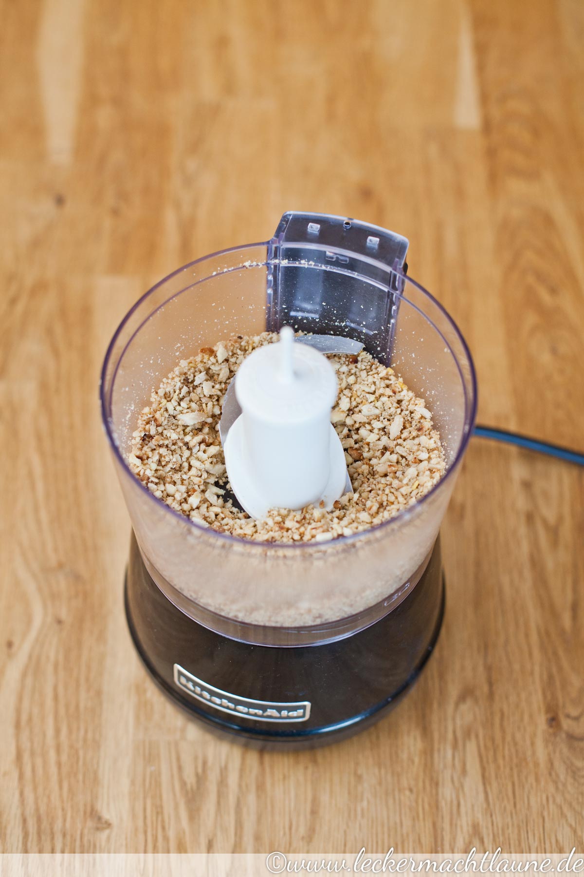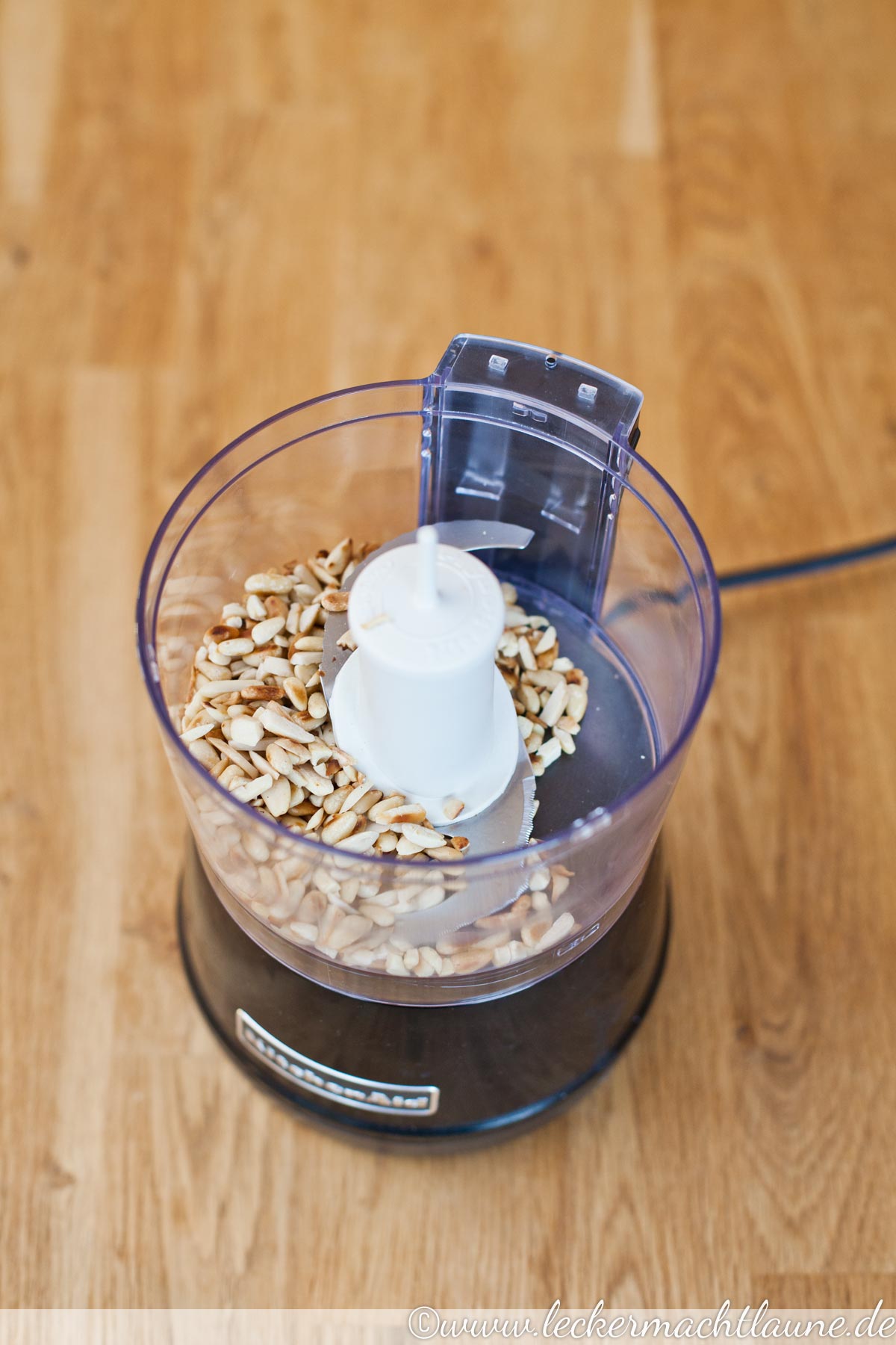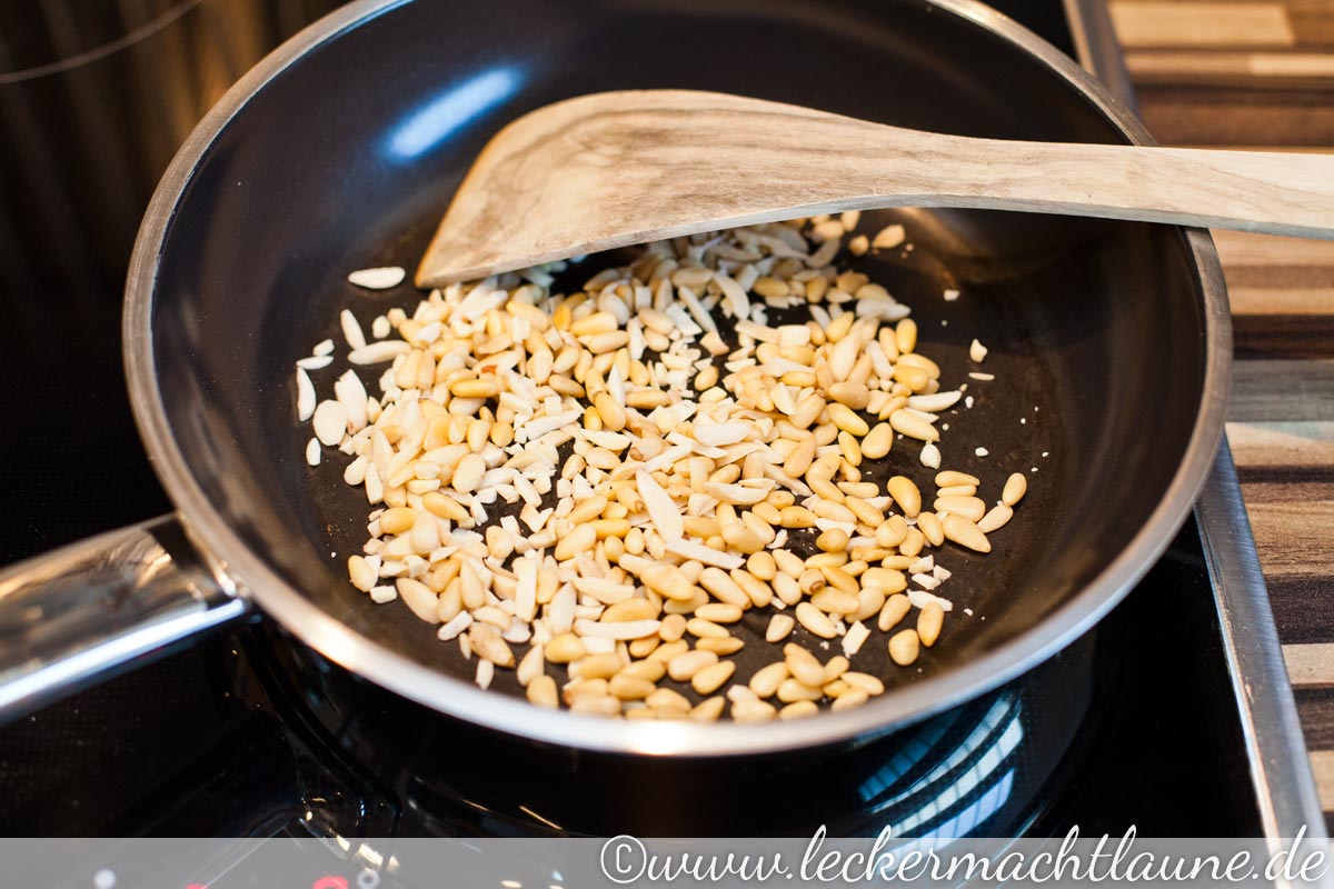 1. Zuerst Pinienkerne und Mandeln in einer Pfanne ohne Fett anrösten, dann kurz abkühlen lassen und klein hacken (ich mach das schnell im Zerhacker*).