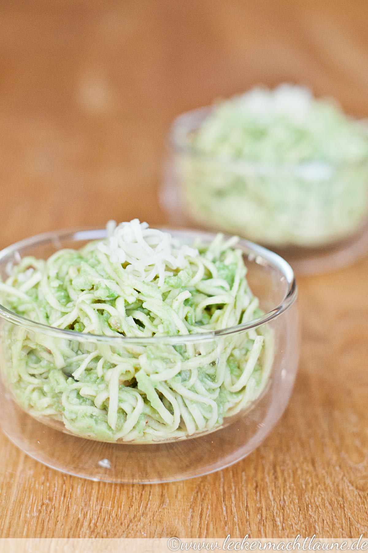 3. Wir hatten frische Spaghetti dazu, aber das Avocado-Pesto schmeckt auch super zu Ofenkartoffeln, auf Brot oder mit Spiegeleiern.