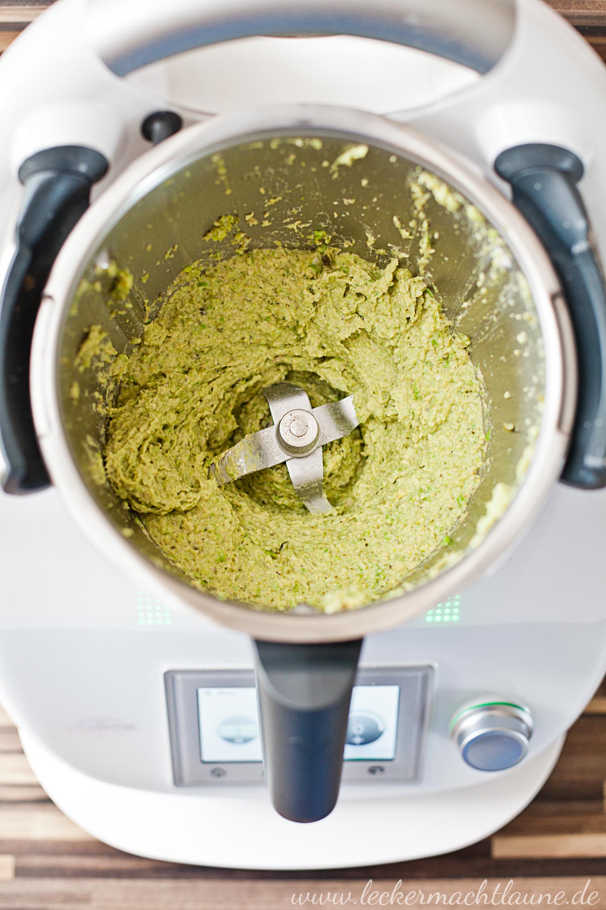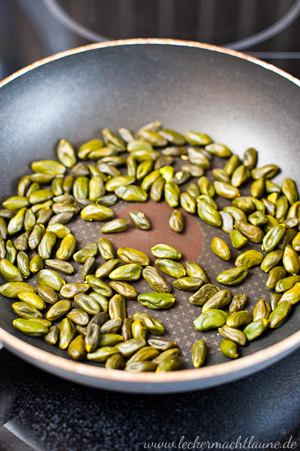 1. Zuerst die Erbsen in kochendem Wasser 5min lang blanchieren, rausholen und abschrecken. Danach die Pistazienkerne in einer Pfanne ohne Fett anrösten. Anschließend zusammen mit den restlichen Pesto-Zutaten pürieren und schon ist das Erbsen-Artischocken-Pesto fertig.