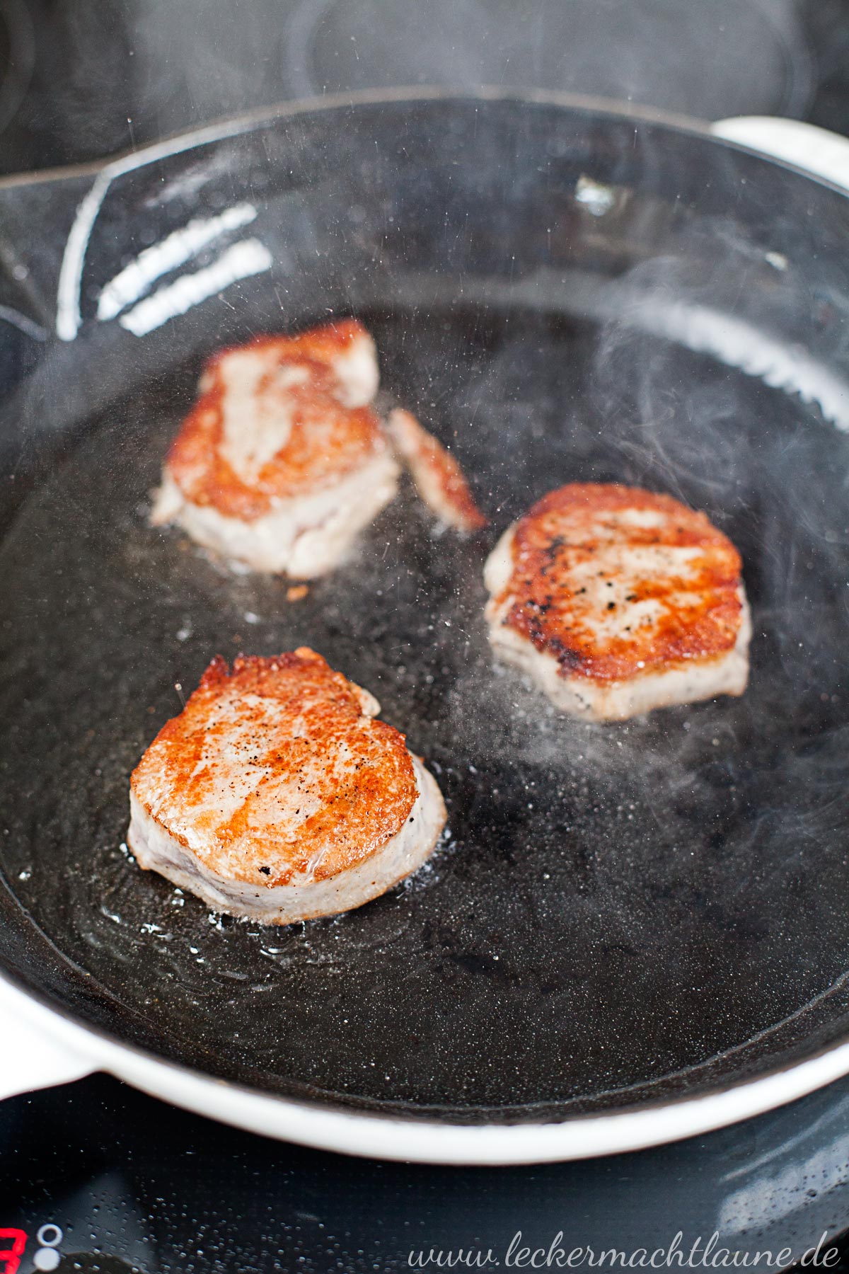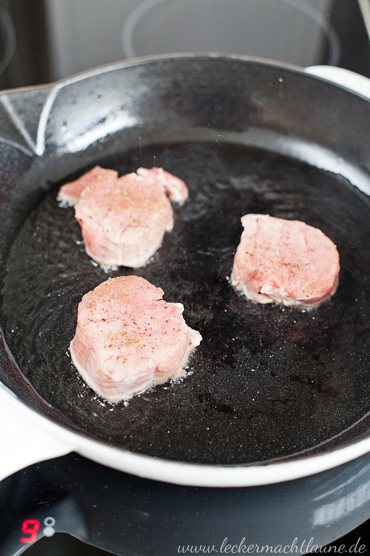 2. Das Schweinefilet in ca 1,5cm dicke Scheiben schneiden, mit Salz und Pfeffer würzen und in einer sehr heißen Pfanne knappe 2min pro Seit anbraten.