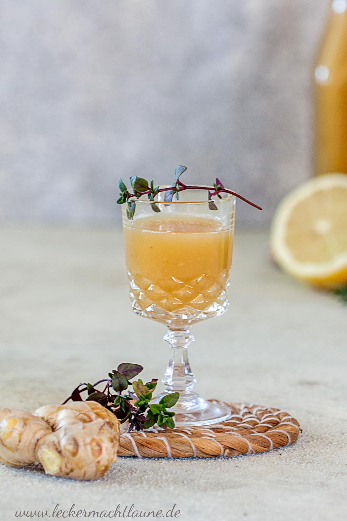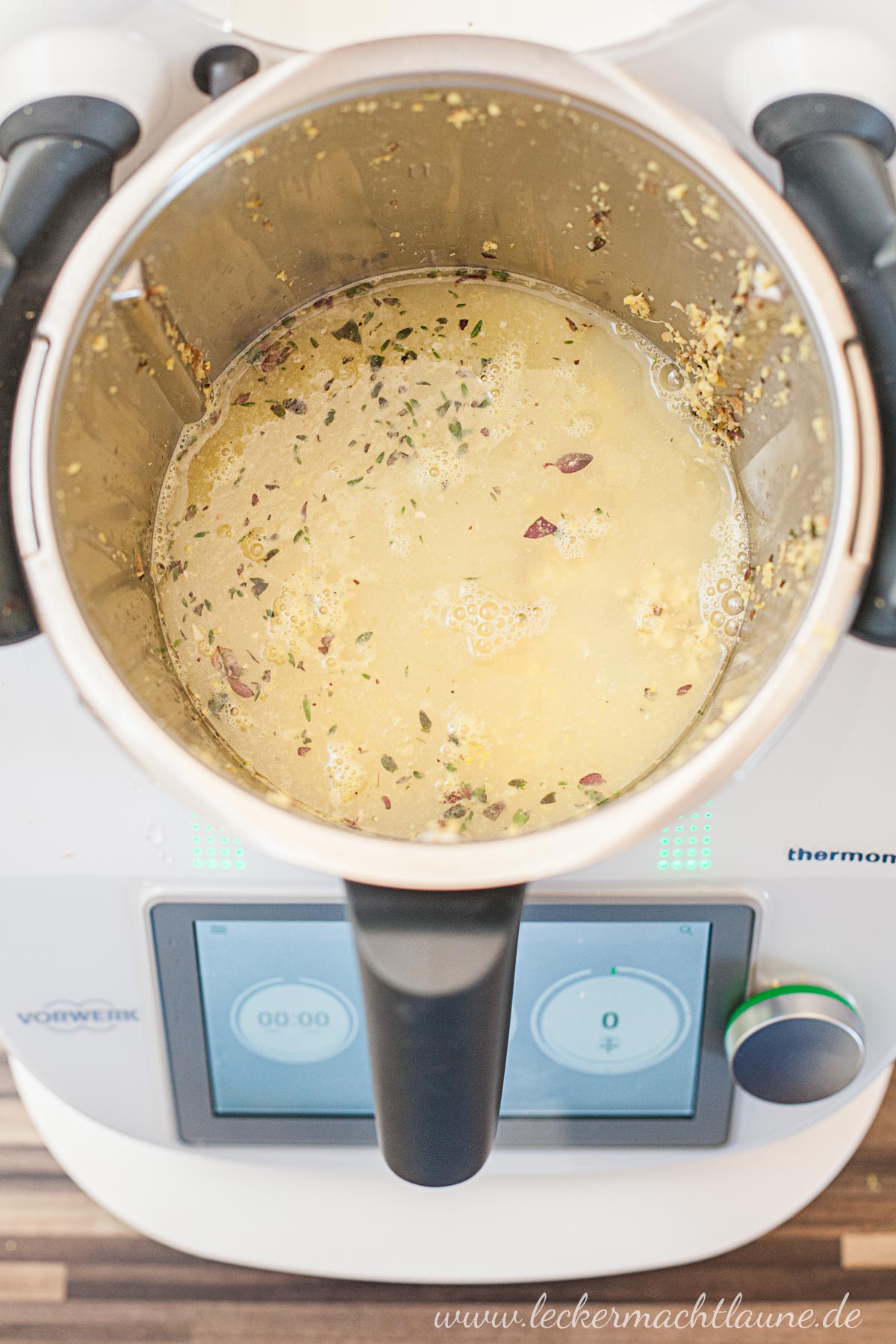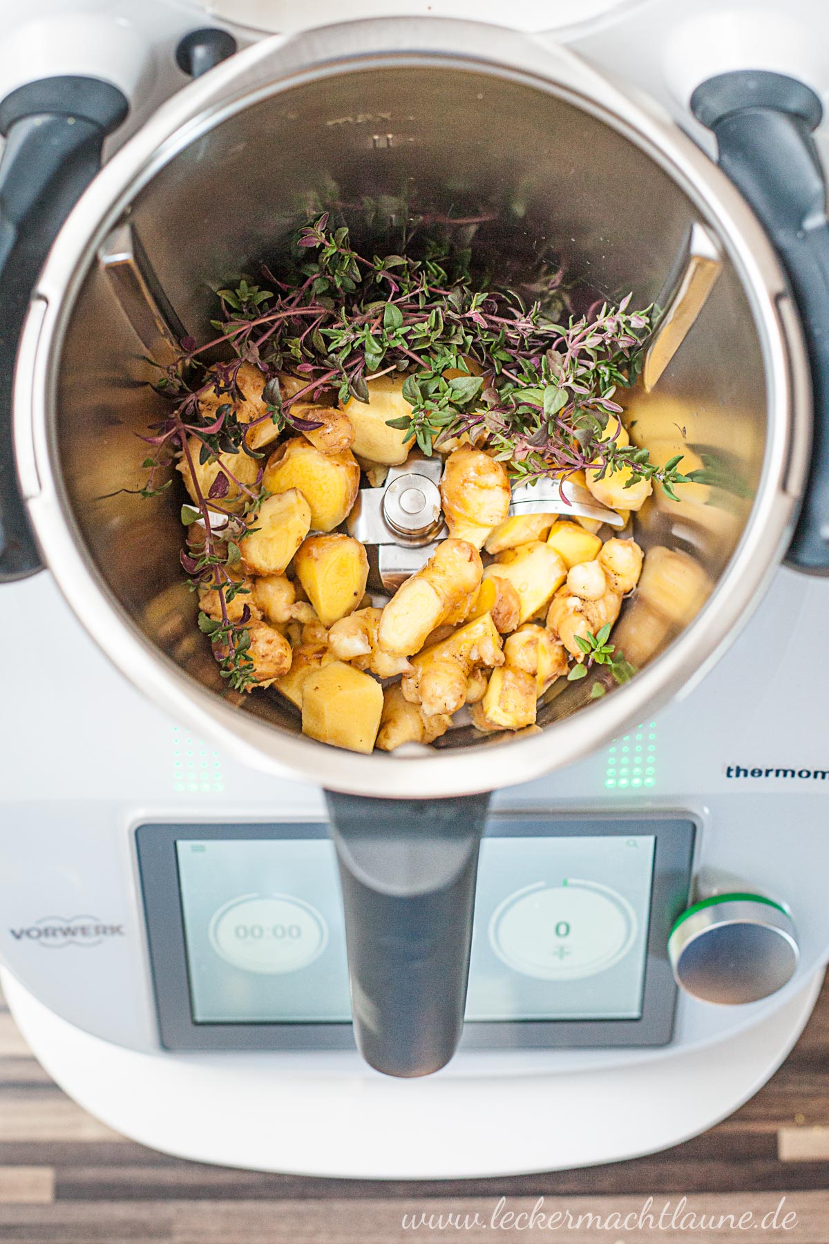 1. Zuerst den in grobe Stücke geschnittenen Ingwer und den Thymian pürieren (TM: 10 Sekunden/Stufe 8). Danach Saft und Schale der Zitronen sowie das Wasser dazugeben und alles zusammen 30min lang köcheln lassen (TM: 30 Minuten/90°C/St. 2 ohne Messbecher im Deckel).