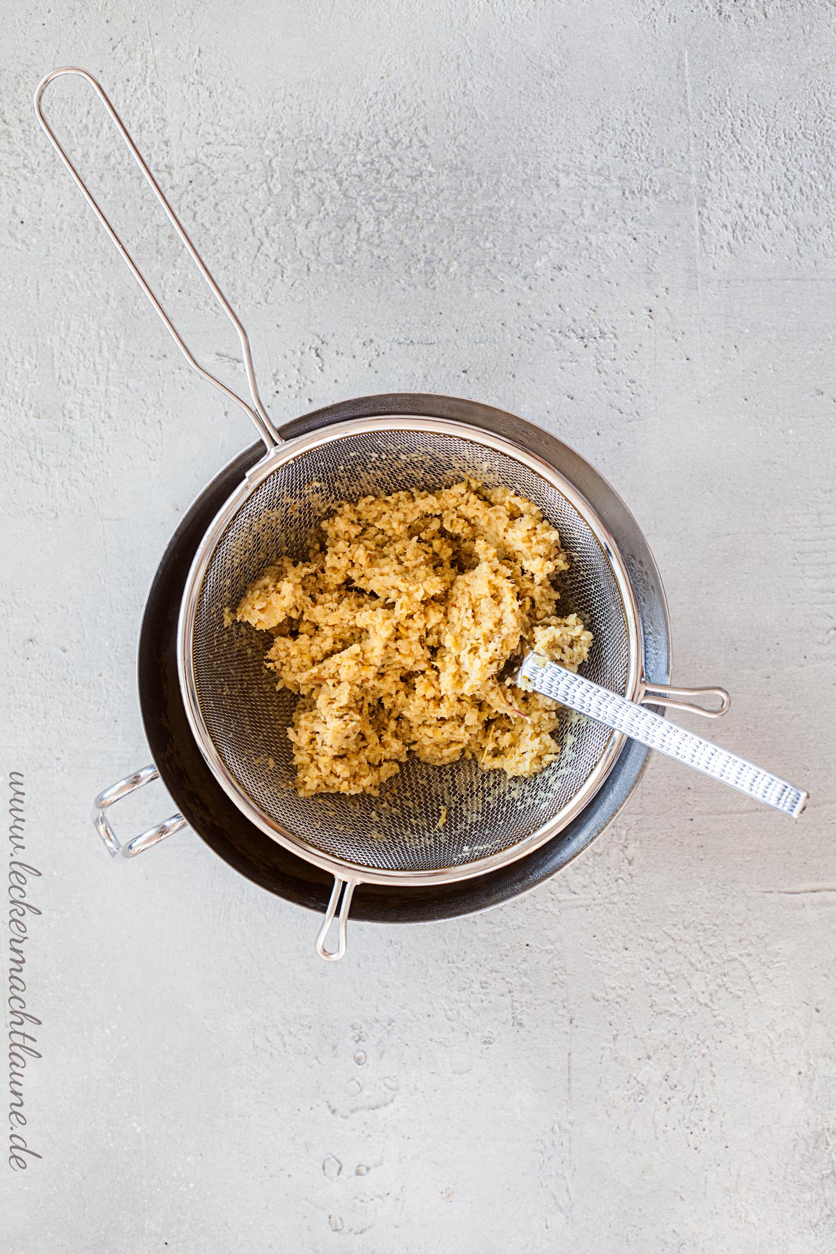 2. Nun alles gründlich durch ein Sieb streichen und die rausgekommene Flüssigkeit (bei mir waren es 550ml) auf 40°C abkühlen lassen. Dann mit dem Honig vermischen (TM: 15 Sekunden/St. 4) und noch warm in sterilisierte Flaschen abfüllen.