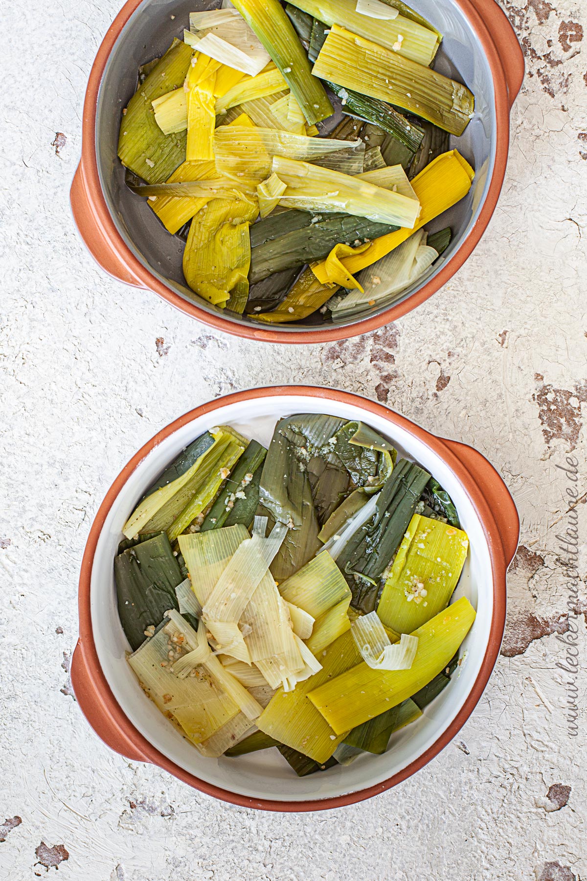 1. Zuerst den Lauch waschen, putzen, halbieren (der Länge nach) und in ca. 5cm lange Stücke schneiden. Nun die Gemüsebrühe in einem Topf aufkochen, den Lauch hineingeben, Hitze runterregeln und den Lauch zugedeckt ca. 20min lang dünsten bis er durch ist.