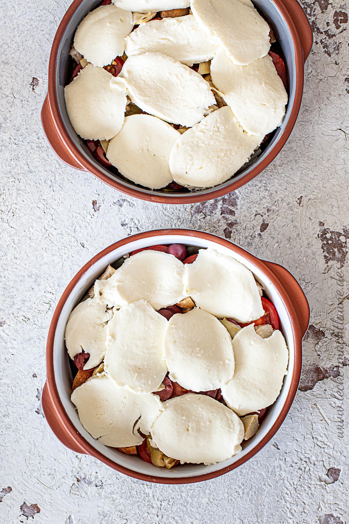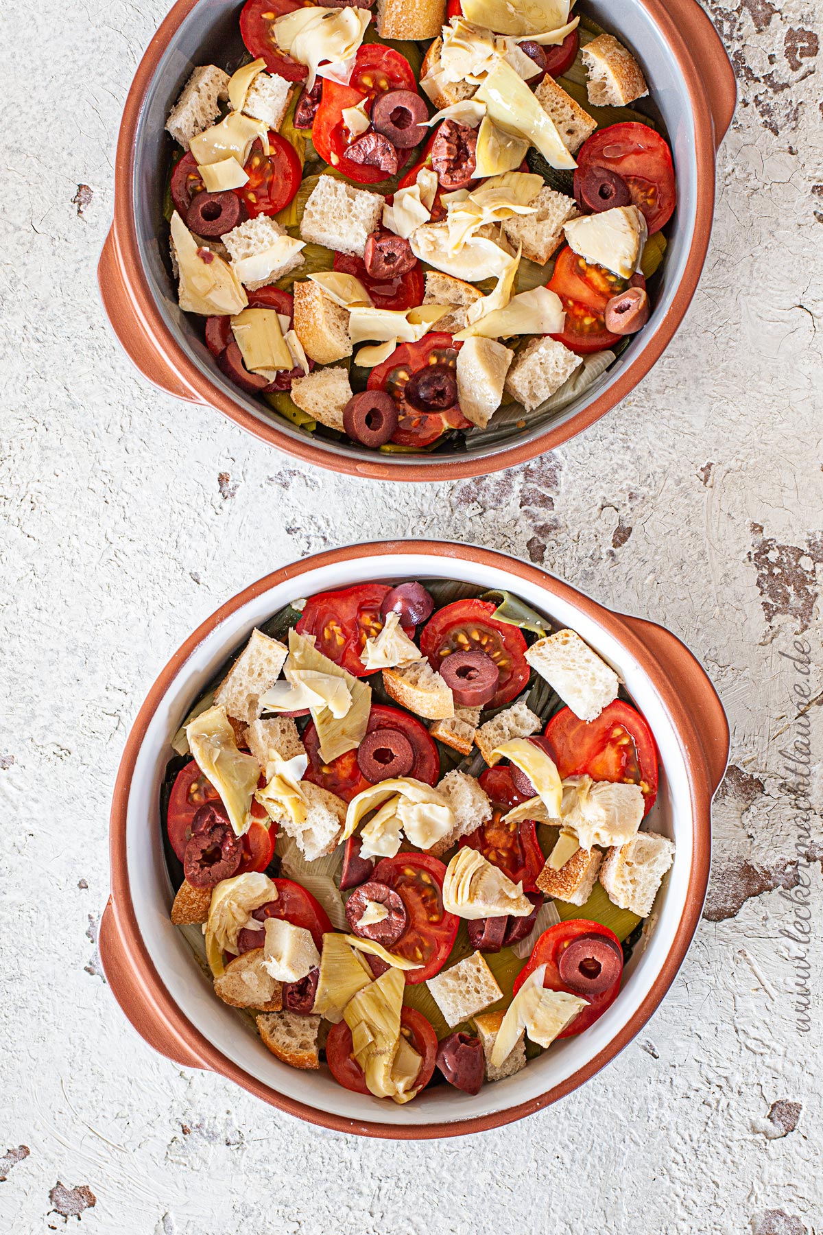 3. Jetzt wird in eine oder mehrere Auflaufformen geschichtet. Ganz unten kommt die Hälfte des Lauchs hin. Darauf dann jeweils etwa die Hälfte der Tomaten, Oliven, Artischocken und Brotwürfel verteilen. Danach mit etwas Salz und Pfeffer würzen und mit den Mozzarellascheiben bedecken. Jetzt wieder Lauch, Tomaten, Oliven und Brot sowie Salz und Pfeffer draufgeben und mit Gruyère bestreuen.